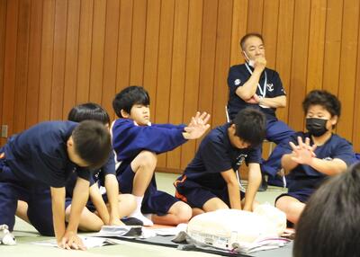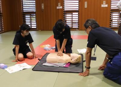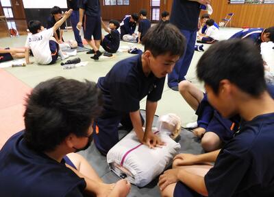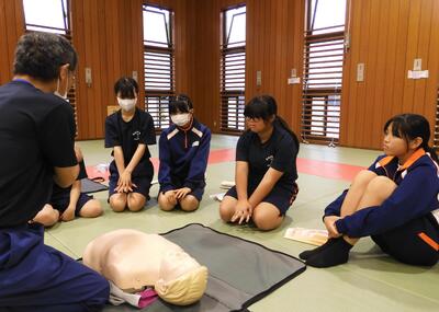 1年生が消防署員の方々から、救急救命法について学びました。心肺蘇生の意味、心臓マッサージや人工呼吸の技法、AEDの使い方など、初めて経験する生徒がほとんどでした。生徒の皆さんは、人の命を救うことにつながることをしっかり理解し、実習に取り組んでいました。