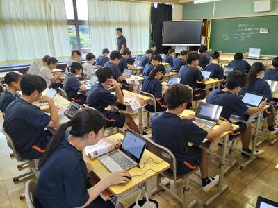 午後の日立警察署スクールサポーターの方の授業参観でも、一生懸命に取り組んでいるとお話がありました。3年生は一人一台端末を使って課題レポートを作成している場面を参観いただきました。レポート作成のレベルの高さと、その集中力を絶賛しておりました。1年生と2年生は「あいさつが素晴らしい」とお褒めの言葉をいただきました。