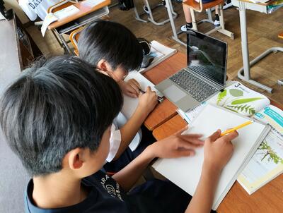 【第1学年】理科・・・タブレットで撮影した画像をもとに、植物の葉や根の特徴を調べました。特徴を捉えてスケッチしたり、友達と協力しながら画像で確認したりしました。