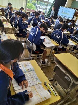 【第3学年】英語・・・現在完了形の学習をALTと一緒に学習しました。2年時の復習内容でしたが、教師の説明をしっかり聞き、ノートにまとめていました。