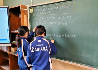 2年生の社会の授業では、「日本の交通網や通信網の結びつき」について学習しました。自分やグループの考えを電子黒板を使って、みんなの前で堂々と発表しています。落ち着いて発表している姿、発表者の考えをしっかり聞く姿に感動しました。