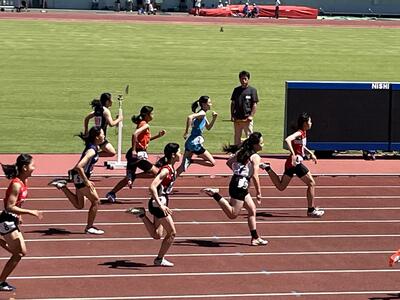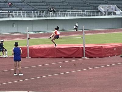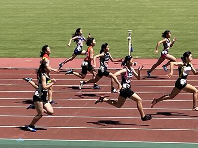 1年生女子2名が1年女子100M予選に出場しました。二人とも自分のベスト記録を更新しようと果敢に挑戦していました。2年生男子1名が2年男子100M予選に出場しました。強豪ひしめく中、ゴールを目指しました。3人とも準決勝進出を惜しくも逃しましたが、次は、県総体陸上で頑張ってほしいと思います。3年女子1名が、共通女子走り高跳びに出場しました。県標準の130cmスタートで、最初からなかなかクリアできる選手はいない中で、軽やかに3回の試技を行いました。わずかに身体がバーに触れてしまいました。次の県総体陸上でリベンジを果たしてほしいと思います。