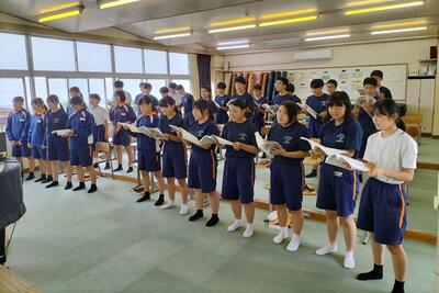4階にある音楽室の下の階(3階)の廊下を歩いていると、素晴らしい校歌の歌声が響いてきました。音楽室に向かうとそこには3年生がいました。大きな声で、リズムをとりながら歌っている姿がすばらしかったです。さらに、担当教師が、「次は『My Own Road』を歌いましょう。」と声をかけると、指示をしなくても自然と合唱の隊形になり、歌い始めました。さすが3年生だなぁ・・・と、改めて感心してしまいました。