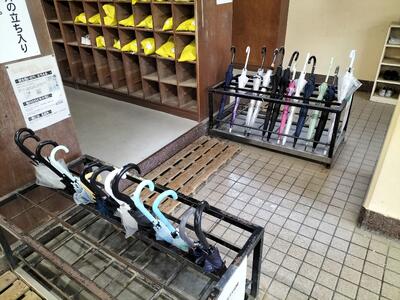 2学期最終日は雨の一日となりました。久しぶりの雨となり、多くの生徒が傘をさして登校しました。昇降口の様子を確認したところ、1年生の傘立てには、方向がそろった傘が一列に並んでいました。教師から指導があったわけではなく、自ら率先して行っていたようです。